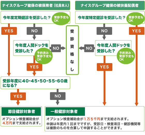 実費の内、1人当たり15,000円/年度を上限として支給(複数の検査の合算可) ただし、被保険者(社員本人)のうち節目健診対象者(その年度内に40歳・45歳・50歳・55歳・60歳になる方)へは4万円/年度を上限として支給。 |